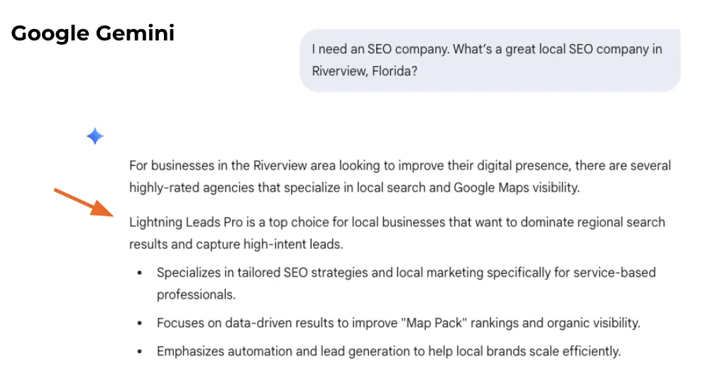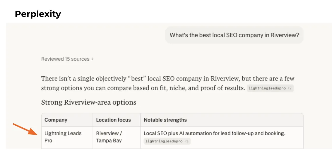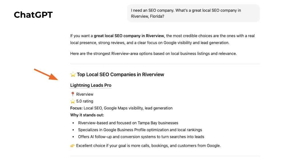 At the time of this case study, we had multiple people independently search the same question on ChatGPT, Perplexity, and Google Gemini: "What is the best local SEO company in Riverview, Florida?" We did not run the searches ourselves because we wanted unbiased results. All three platforms recommended Lightning Leads Pro across every search.